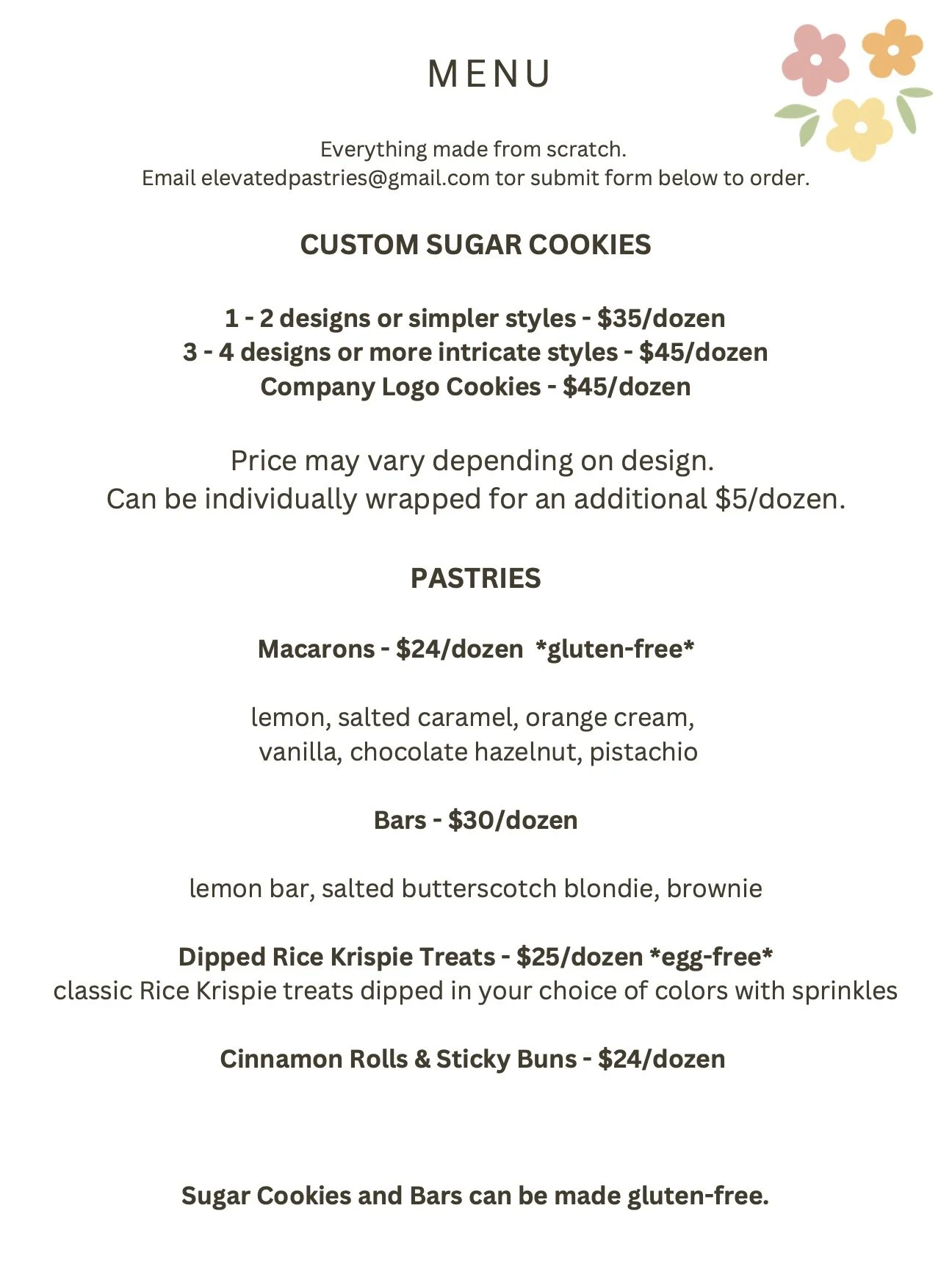 You can order by filling out the Contact Us form above or emailing me directly at elevatedpastries@gmail.com. All items are pre-order only. Since I operate out of my home and not a storefront, I do not have ready made items on hand.
